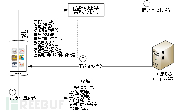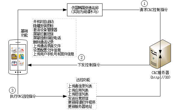 上传手机号、固件信息,并请求远控指令,根据C&C服务端下发的指令执行远程控制行为。