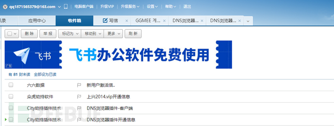 邮箱中还包含大量PC端木马程序,DNS配置SP,DNS批量域名生成器,跳转劫持代码等,说明该邮箱常用来接收其他木马文件: