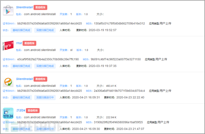 在恒安嘉新 App全景态势与案件情报溯源挖掘平台上,通过应用名称、包名等特征关联搜索相关样本,发现平台上存在大量新型间谍木马类恶意应用,其中,该类恶意程序代码结构、包名及其类似,极有可能是同一批人开发。