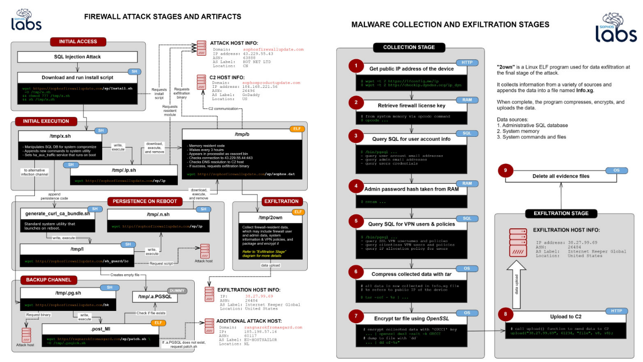 一旦发现这些攻击,Sophos 就将 防火墙修复程序推 送到防火墙,该防火墙会关闭SQL注入漏洞并删除恶意脚本。