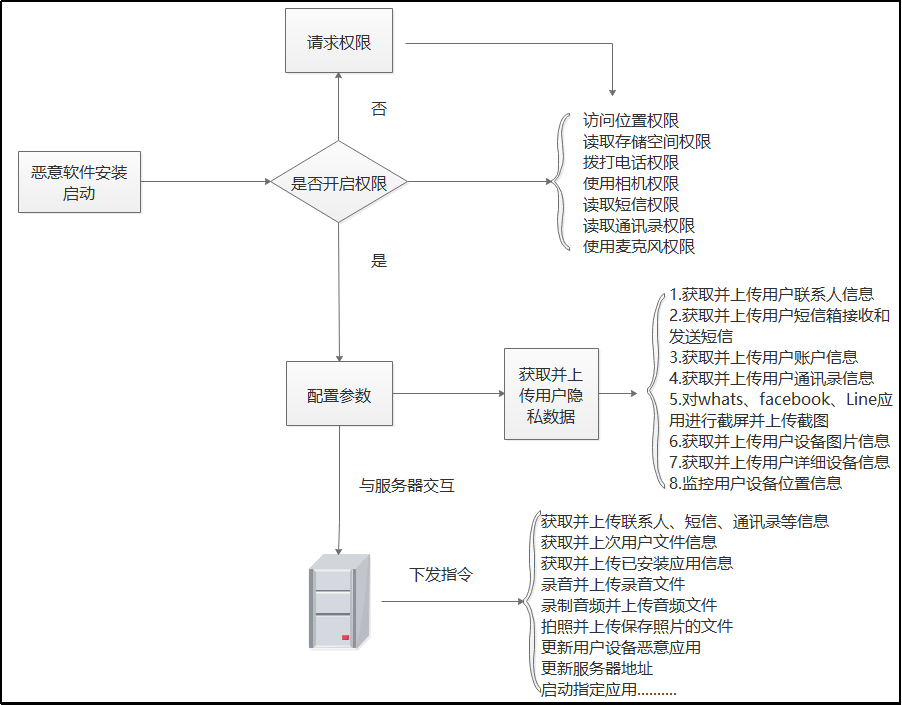 在获取并上传用户设备通讯录、通话记录、短信等敏感信息后,恶意程序与服务器通信。并下发远控指令。