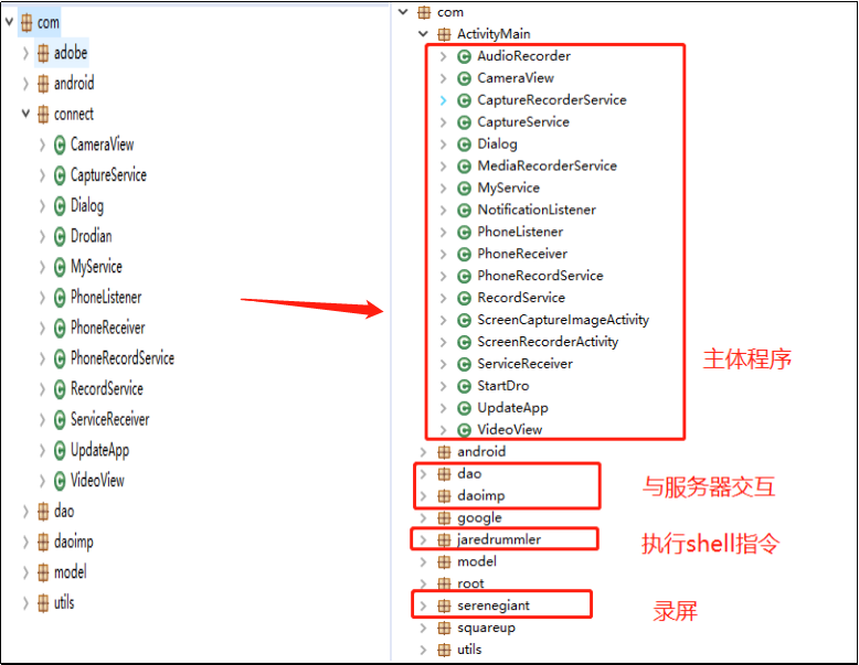 恶意软件经历了几代更新,最新版本的恶意软件增加了com.jaredrummler和com.serenegiant包,用于实现执行shell指令以及录屏功能,不仅如此,主体程序中还增加了截屏、录音、录像以及监听通知消息的功能。