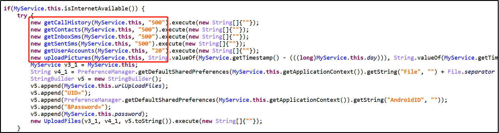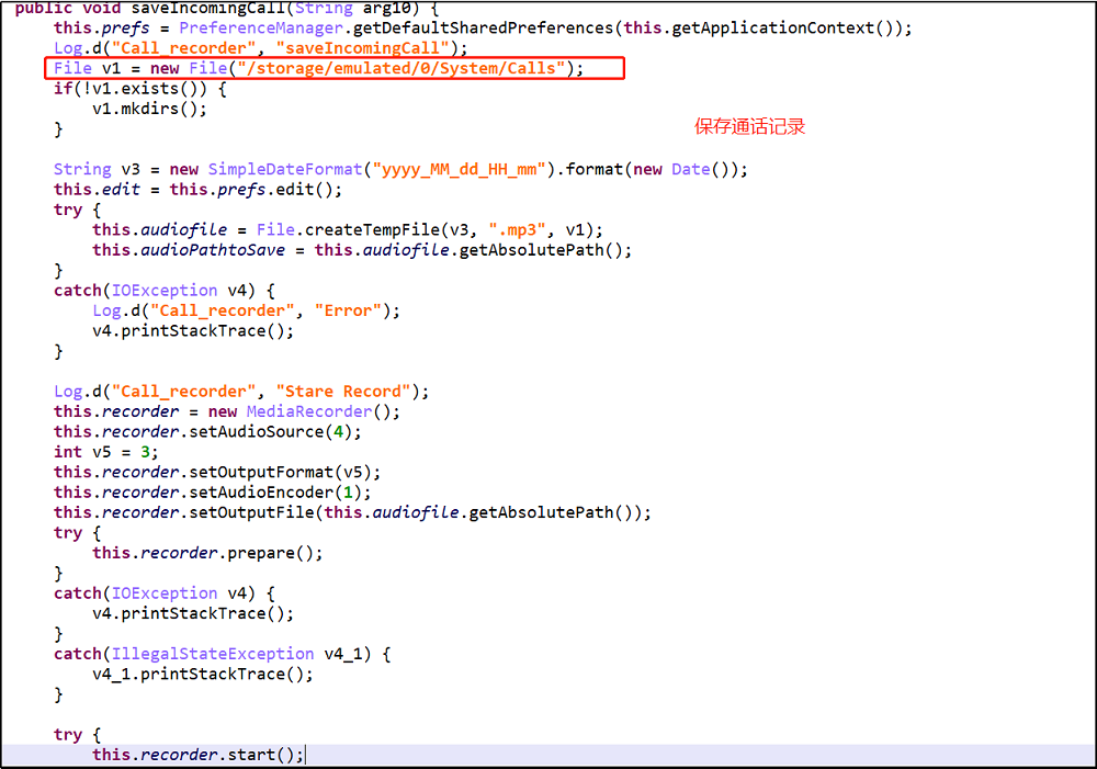 恶意软件通过远控指令控制用户设备,上传用户敏感信息、对用户通话记录进行录音、对用户设备进行录像、拍摄照片监控用户行为。不仅如此,恶意软件还可从服务器获取恶意软件更新包更新其恶意代码。