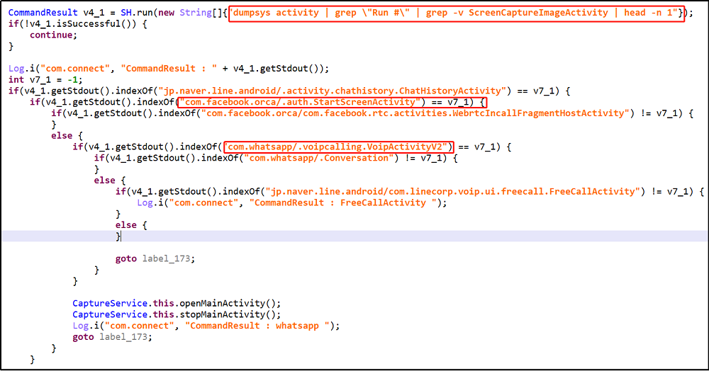 执行shell指令“dumpsysactivity”,检测用户设备应用运行状态,如果检测到WhatsApp、Facebook、Line应用的某界面处于活跃状态,对这些界面进行截屏。