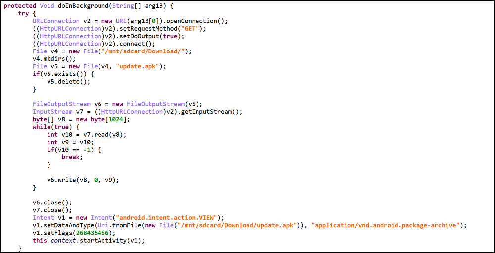 从/mnt/sdcard/Download目录下获取update.apk更新恶意软件,这使得恶意程序能随时更新其恶意代码以执行更多恶意行为。