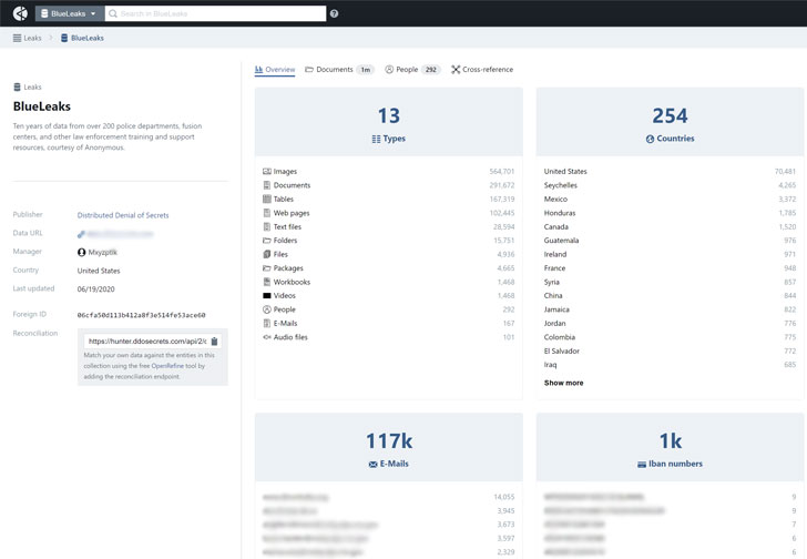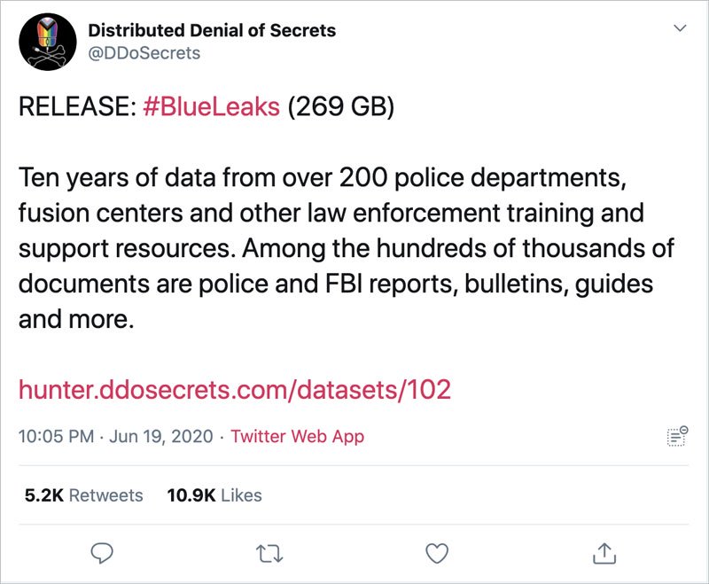 该透明倡议组织名为“DDoSecrets”, 在网上公布的数据转储名为“BlueLeaks”。其中,这些数据中包含了执法机构和个人数十年来的敏感个人信息。