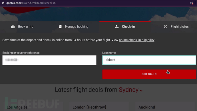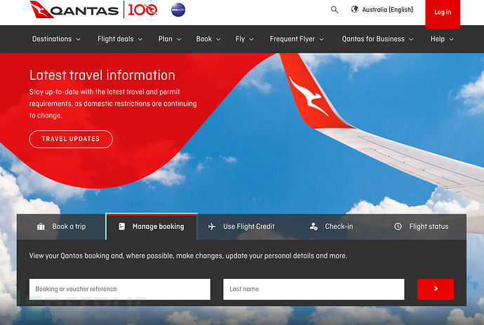 我来到澳航网站qantas.com.au,点击其中的订票管理“Manage Booking”,如前所述,这里仅只需要乘客的预订代号(Booking Reference)和姓氏就可成功登录,这里有了Tony Abbott的预订代号,再加了他的姓氏Abbott,Bingo,登录成功: