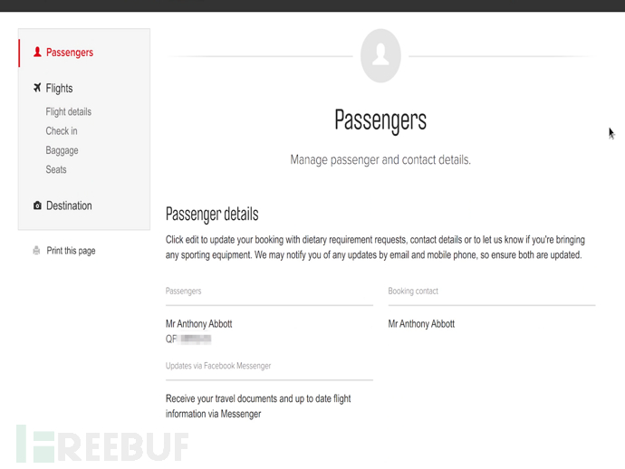 这样,我就以Tony Abbott的身份登录了他的机票行程管理页面了,从中可以看到他的全名、飞机起飞时间、航旅会员号(Frequent Flyer number),另外,还可以看出该机票是通过订票中介预订的,但除此之外好像没有什么敏感的东西了。由于航班行程已经是过去式,因此,我也不能对其中的属性进行修改。难道就这样收手了吗?不。