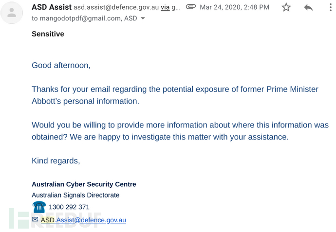 作者通过官方渠道与澳大利亚情报机构-澳大利亚信号局(Australian Signals Directorate, ASD)取得了联系,上报了该数据泄露事件: