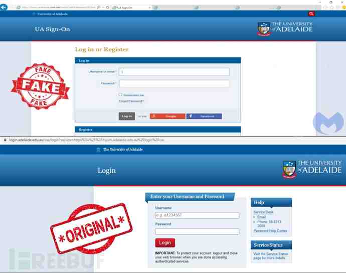 伪造和真实的阿德莱德大学网站
