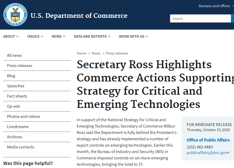 “关键技术和新兴技术国家战略是保护美国国家安全,确保美国在军事、情报和经济事务中保持技术领先地位的重要战略部署。”美国商务部部长Wilbur Ross说道,并表示“美国商务部已经对30多种新兴技术的出口实施了管控,我们将继续评估和确定未来还有哪些技术需要管控。”
