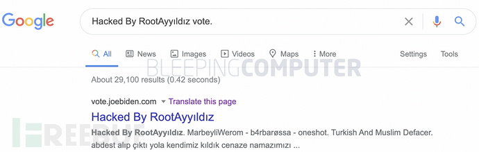 本周,因支持Biden-Harris总统竞选活动而建立的Vote Joe网站,遭到了土耳其黑客“RootAyyildiz”的入侵,黑客还在网站上挂出宣传信息页面。