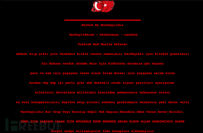 根据黑客在入侵网站上留下的说明,名为“ RootAyyildiz”的黑客声称此事是自己的杰作。此外,该黑客还提到了其他ID例如“ MarbeyliWerom”,“b4rbarøssa”,“ oneshot”和“Turkish And Muslim Defacer”。
