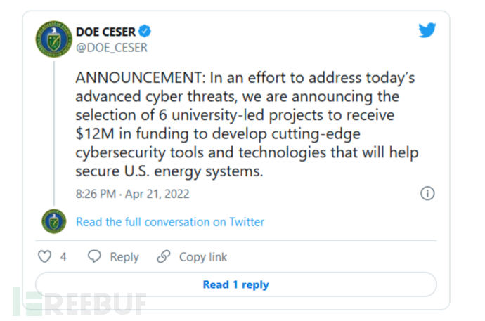 当地时间4月22日消息,美国能源部(DOE)宣布,将向六所大学团队提供1200万美元资金,用于开发网络攻防工具,以保护美国能源输送系统免受网络攻击。