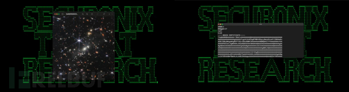 在图像查看器中,这是一张由 NASA 的詹姆斯韦伯望远镜于 2022 年 7 月发布的星系团 SMACS 0723图片,若使用文本编辑器打开,则会显示伪装成内含证书的额外内容,其本质是Base64编码的恶意有效载荷。有效载荷的字符串使用ROT25进一步混淆,而二进制文件使用XOR来隐藏Golang程序集,以防止分析人员发现。除此之外,这些程序集还使用了案例修改来避免安全工具基于签名的检测。