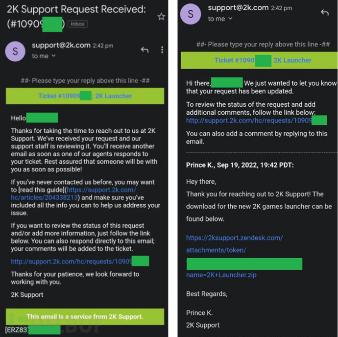 9月20日,2K证实其帮助台平台被黑客入侵, 并被通过嵌入式链接向用户推送含有Redline Stealer 恶意软件的虚假支持票。随后,2K关闭了其支持门户网站以调查违规行为,并建议收到电子邮件并单击链接的用户重置浏览器存储的密码,检查其帐户是否存在可疑活动。